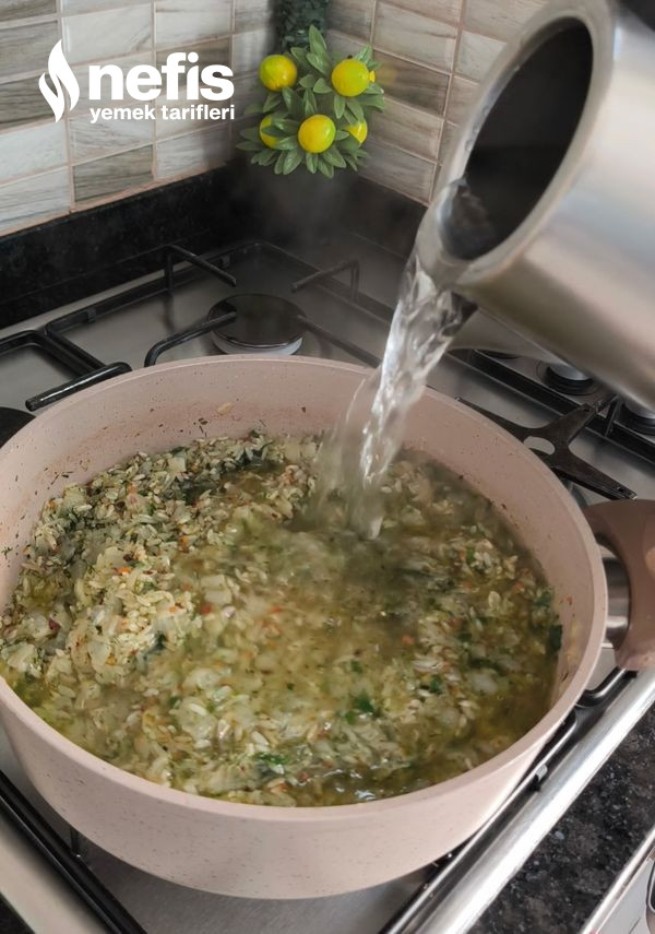 - Soğanları sıvı yağda kavurun, yıkayıp süzdüğünüz pirinçi ekleyin ve biraz kavurduktan sonra sırayla zerzevat kurusu, dereotu, maydanoz, bahatları ve tuzu ekleyip karıştırın ve üzerine geçerek kadar su ekleyip kapağını kapatın ve kısık ateşte pişirin.