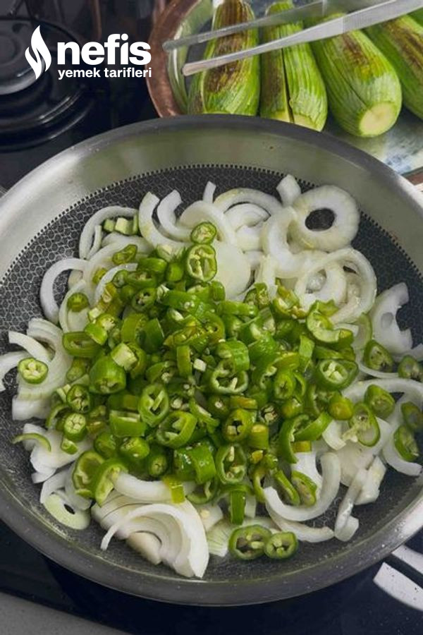 - Tavaya yarım çay bardağı kadar zeytinyağı alıp kabakları kızartın… onlar kızarırken öbür bir tavada irice doğranmış; ya da tıpkı tavada yapabilirsiniz.