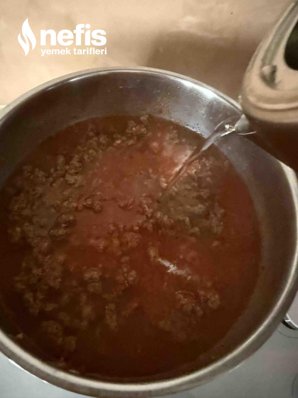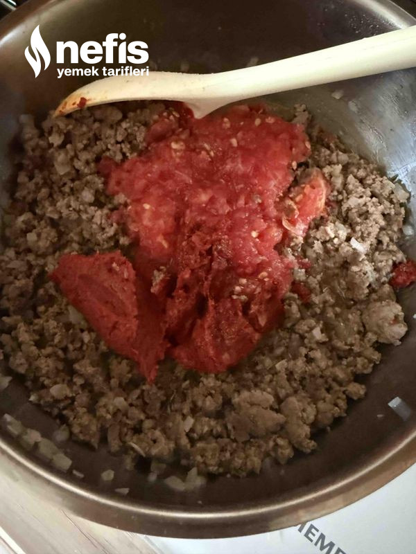 - Kıyma suyunu çekince sırasıyla üstüne domates rendesi ve salçaları ekleyelim.