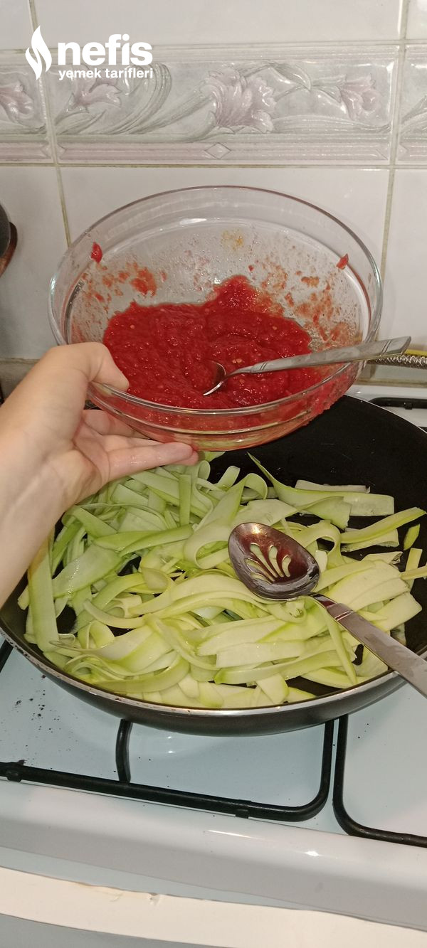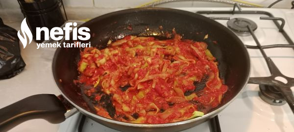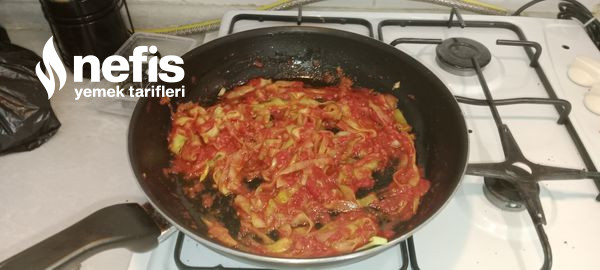 - Sonra kabaklarımı bir müddet karamelize ettikten sonra domates sosumu döküyorum ve kısık ateşte pişirmeye başlıyorum ve suyumu da domates sosu fokurdadığında döküyorum.