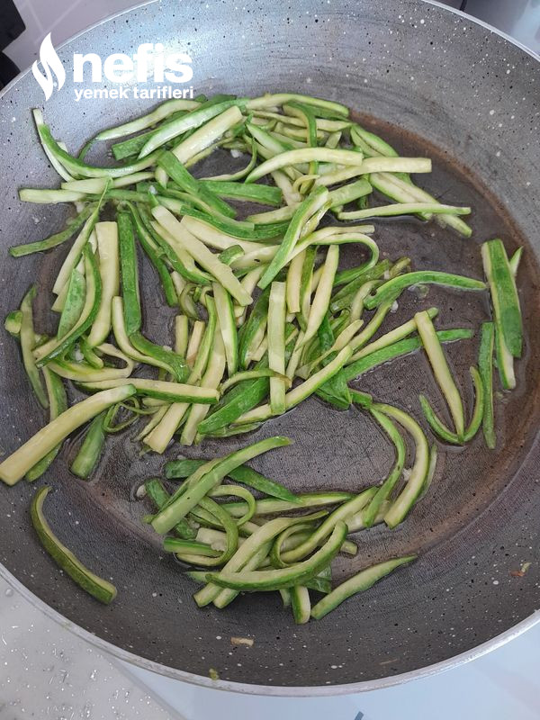 - Jülyen doğradığınız kabakları tavaya alın 1 çay kaşığı tuz ve yağ ile kavurun.