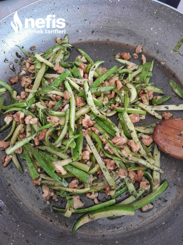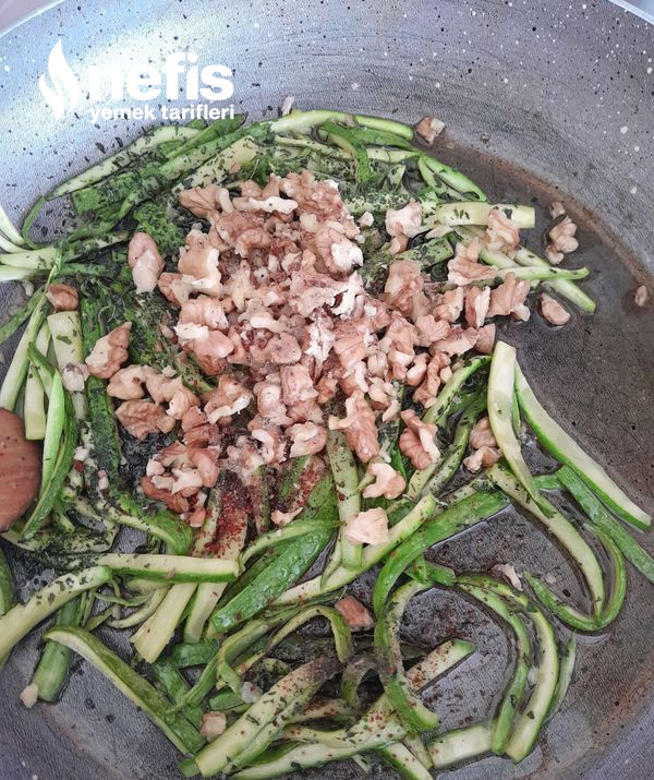 - Kavrulan kabaklarınızın üzerine baharatlarını ve küçük parçalanmış cevizi dökün karıştırın ve altını kapatın.