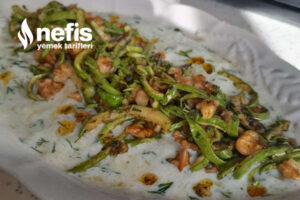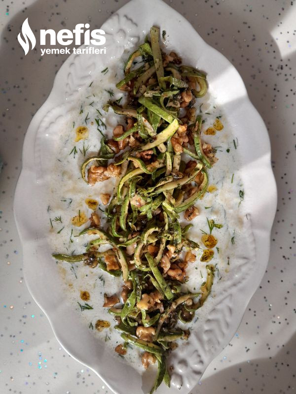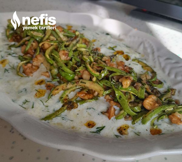 - Sunum için yoğurtlu kabak mezenizi alt tabana koyun. Üzerine jülyen kabaklarınızı bir sıra halinde dizin.