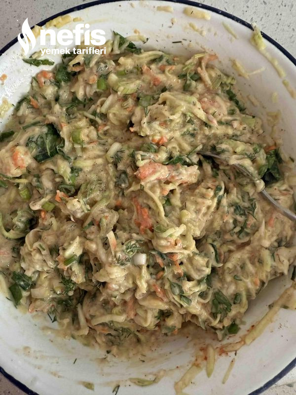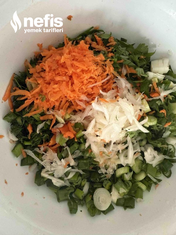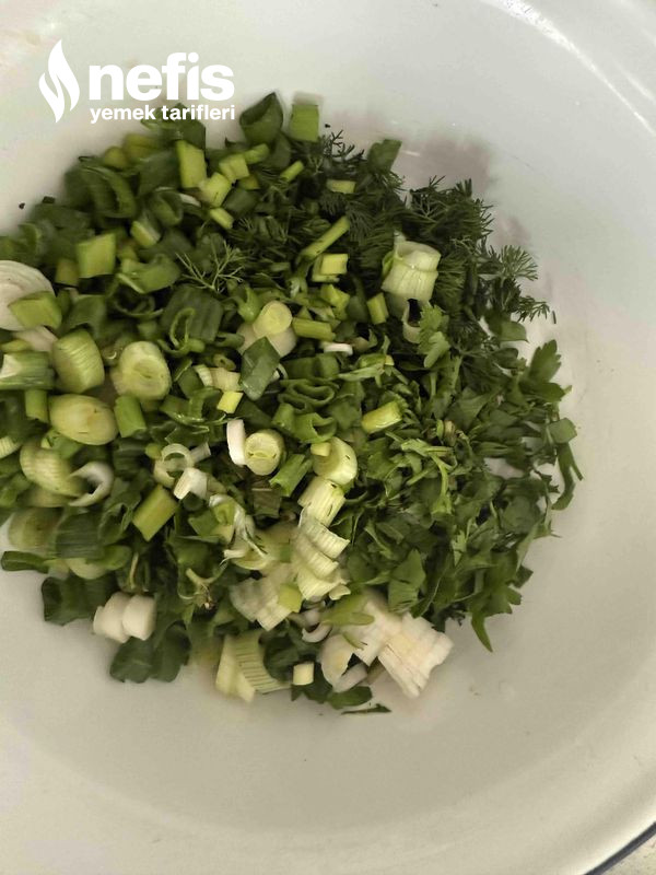 2. Yeşillikleri doğrayalım ve tüm gereçleri karıştıralım. Duruma nazaran un ekleyebilirsiniz.