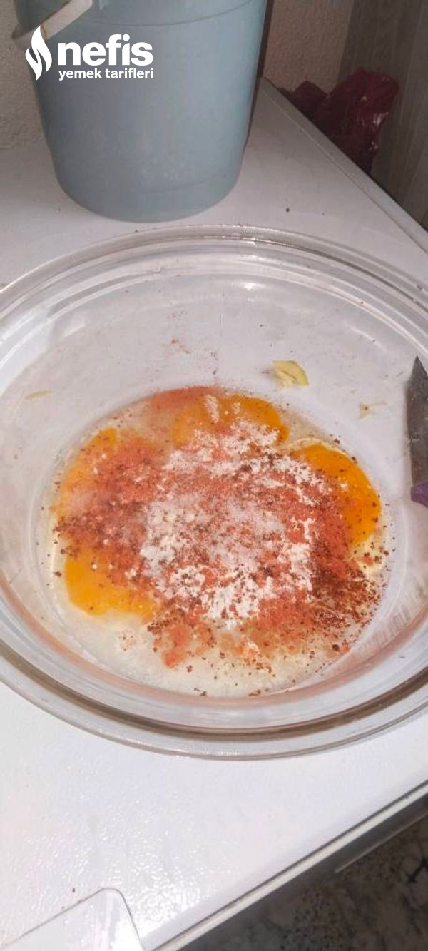 - Karıştırma kabımıza yumurta, un, pulbiber tozbiber, tuzu alalım güzelce çırpalım.