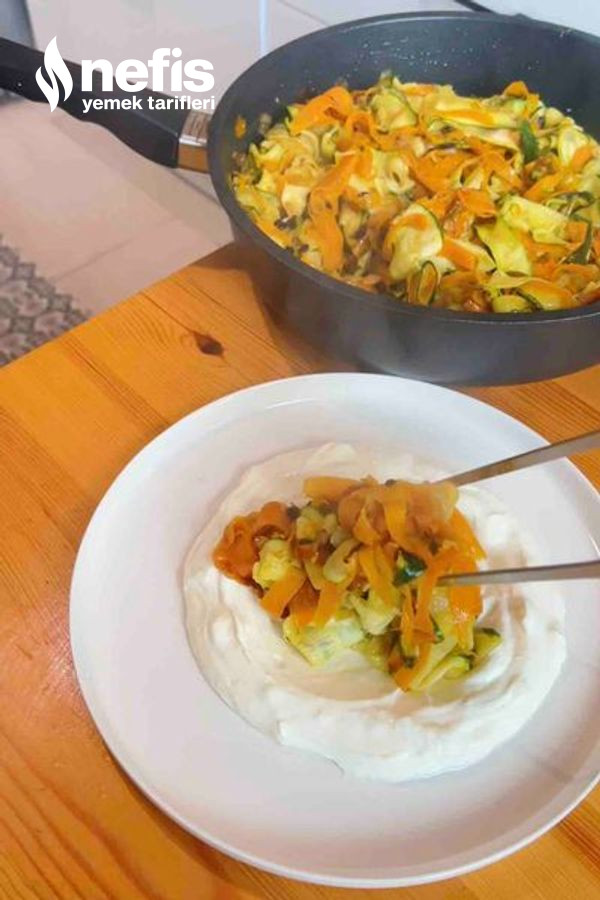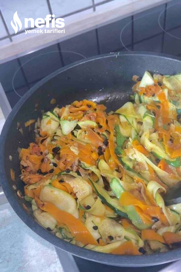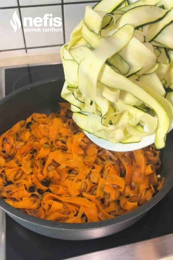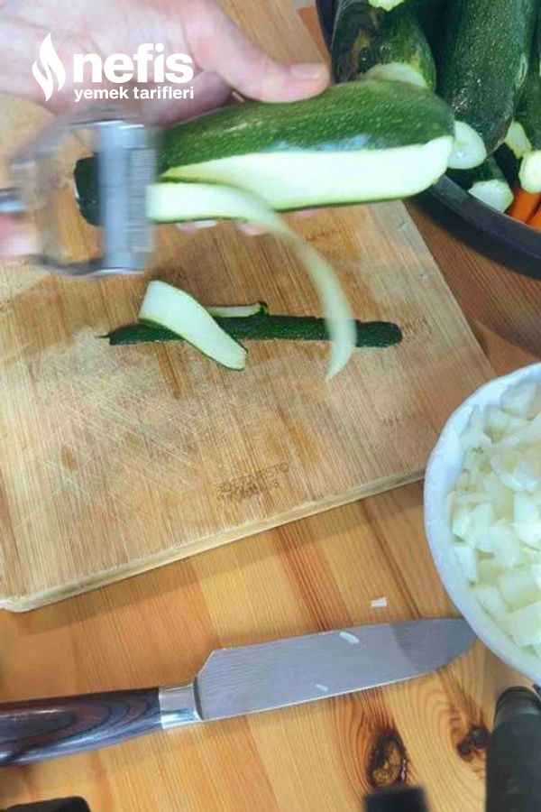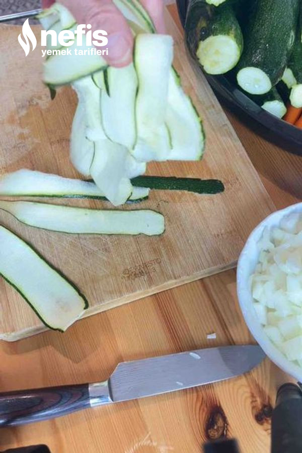 3. Havuç ve kabakları yıkayıp uzun şeritler hâlinde doğrayın (mandolin yahut aparat kullanabilirsiniz).