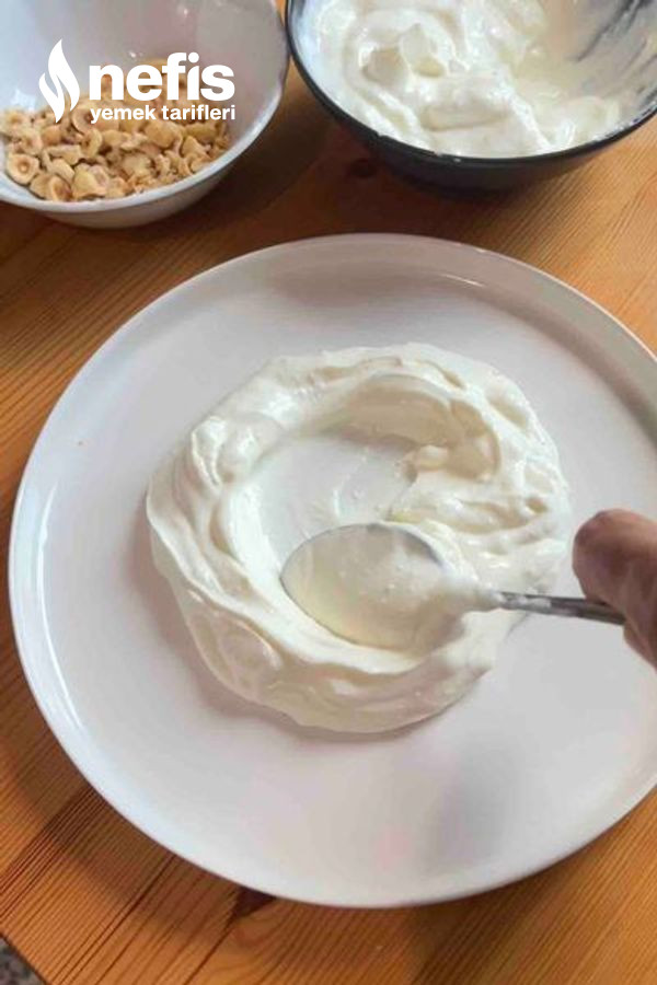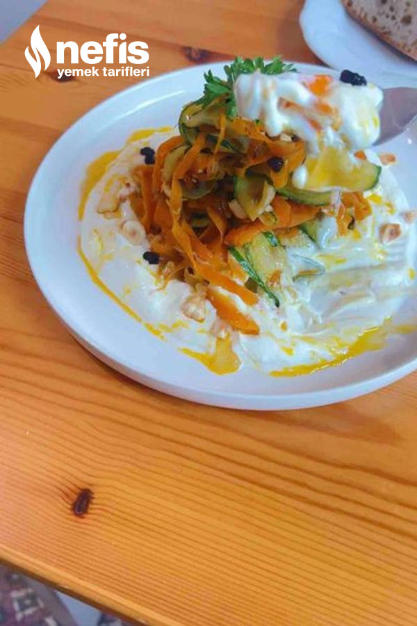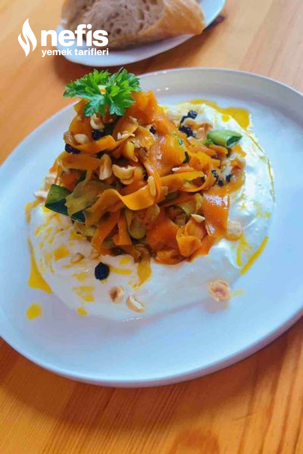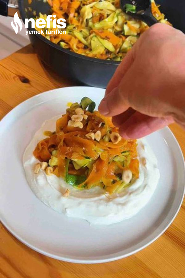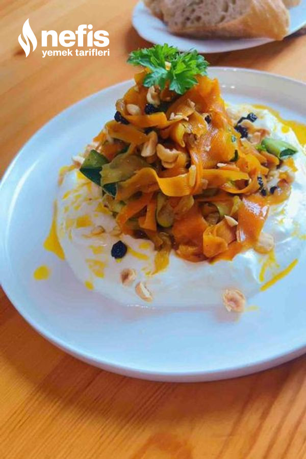 6. Servis tabağına evvel yoğurtlu sosu yayın, ortasına kabak sıyırmayı yerleştirin, üzerine fındıkları serpin.