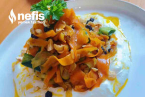 6. Servis tabağına evvel yoğurtlu sosu yayın, ortasına kabak sıyırmayı yerleştirin, üzerine fındıkları serpin.