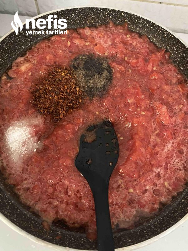 3. Diğer taraftan domates rendesi ,sarımsak, salça ve baharatları bi tavaya alalım, az sıcak su ekleyip kaynatalım.