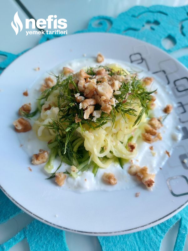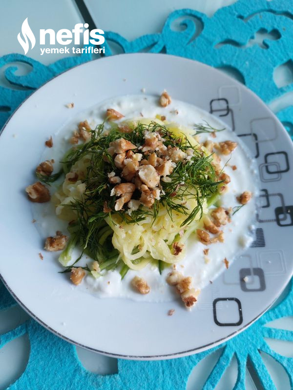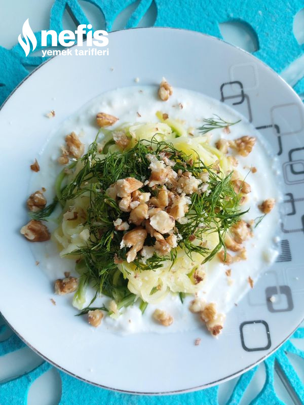- Yoğurdun üzerine salatalık spagettiyi ve sotelenen kabağı koyuyoruz. Son olarak dereotu ile ceviz serpiyoruz.Afiyet olsun 🌸.