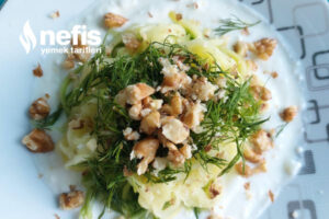 - Yoğurdun üzerine salatalık spagettiyi ve sotelenen kabağı koyuyoruz. Son olarak dereotu ile ceviz serpiyoruz.Afiyet olsun 🌸.