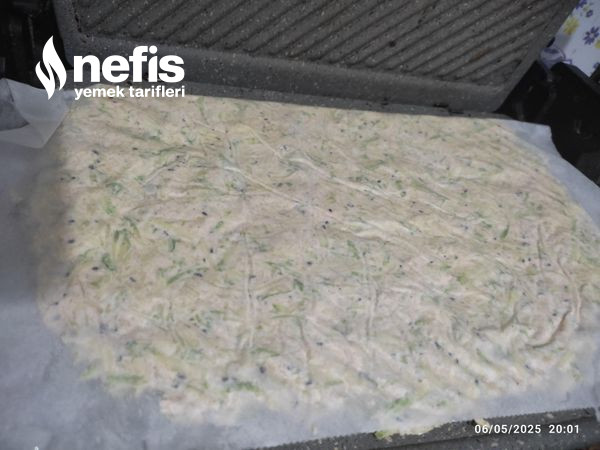 - Karışımı alta gelen yağlı kağıdın yarısına denk getirerek yayıyoruz denetimli pişiriyoruz.