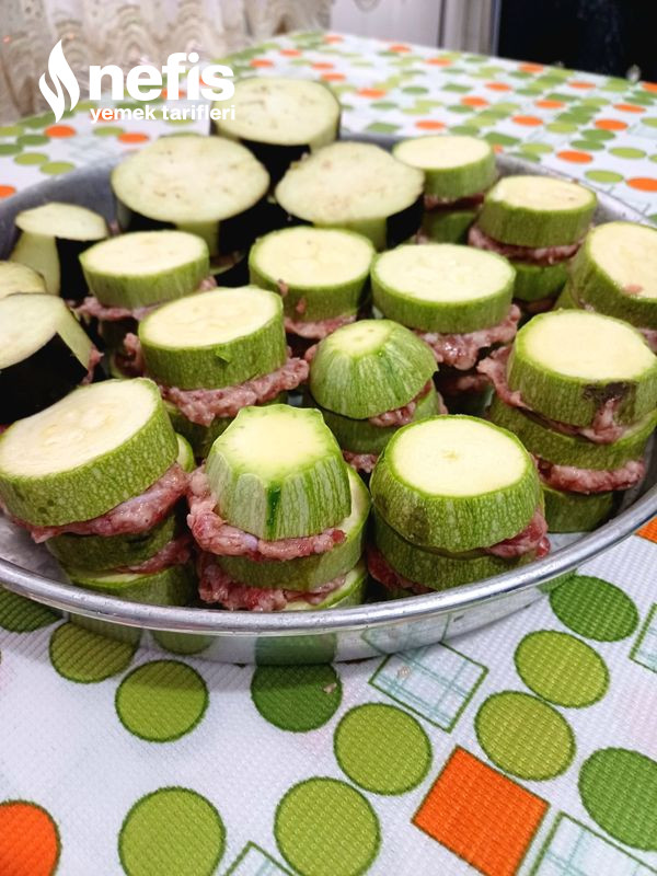 - Daha sonra kestiğimiz kabaktan alıp üzerine kıymamızı koyup kıymanın üzerine tekrar kabakla kapatıyoruz.