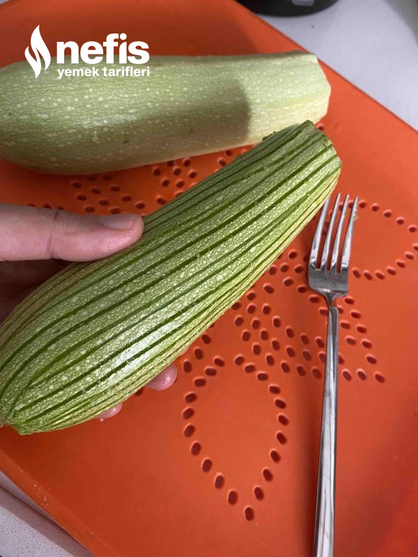 - İstediğimiz halde doğradığınız kabakları ben evvel bir çatal yardımıyla etrafını çizdim ikiye bölüp 1 cm kalınlığında doğradığım.