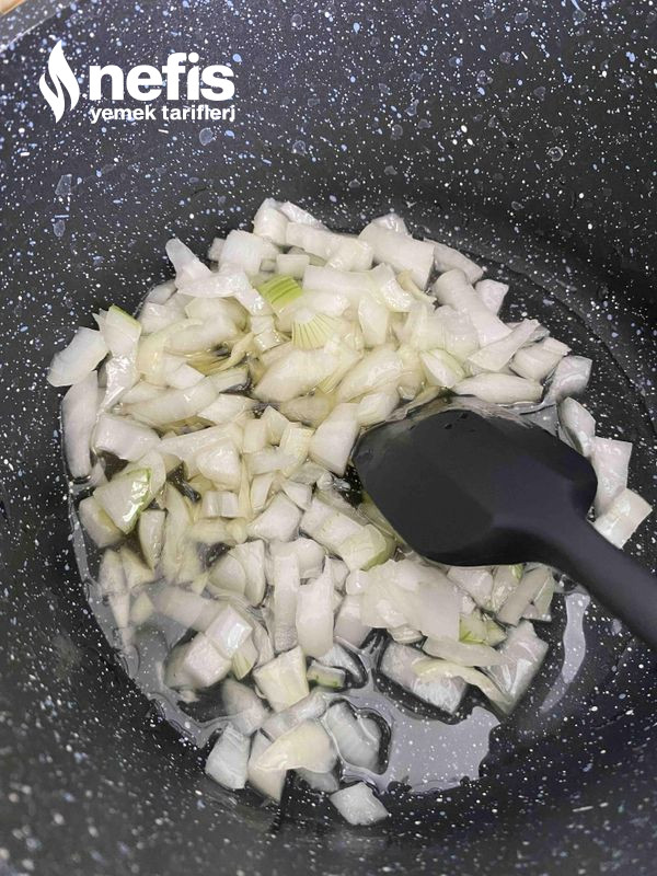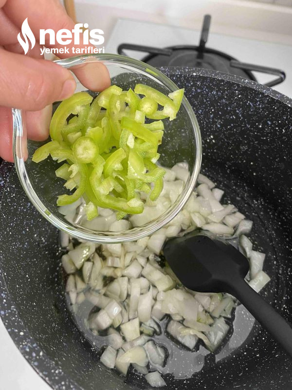 - Soğan küp küp ve biberi yemeklik doğrayalım uygun bir tencerede zeytinyağı ve sıvı yağda hafif pembeleşinceye kadar kavuralım.