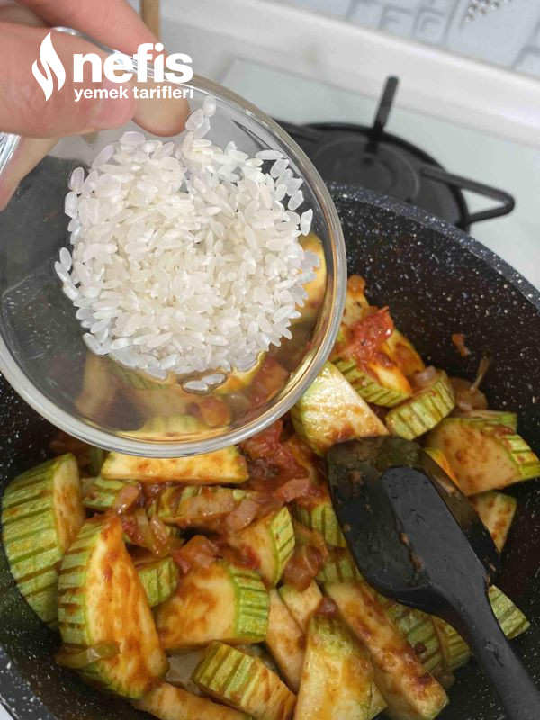 - Kabakları ekleyerek yıkanmış pirinçi ek edip 1-2 çeşit karıştıralım fazla karıştırmaya itina gösterelim.