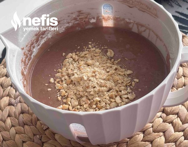 - Son olarak iri çekilmiş fındık içi ekleyip kaşıkla karıştırarak yağlanmış kek kalıbına döküyoruz.