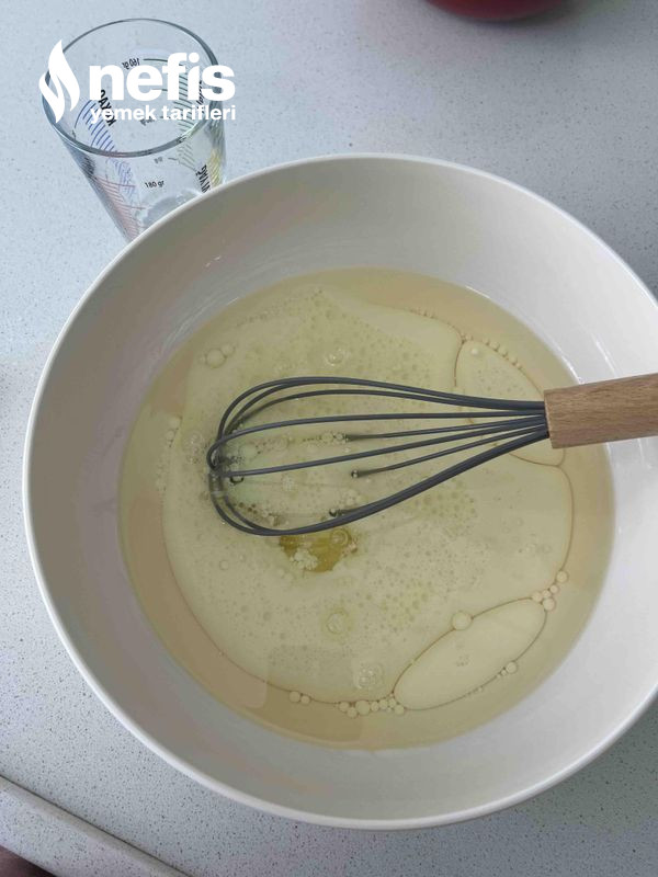 1. Karıştırma kabına birinci evvel sıvı yağ, süt ve yumurta beyazını alıyoruz ve uygunca karıştırıyoruz.