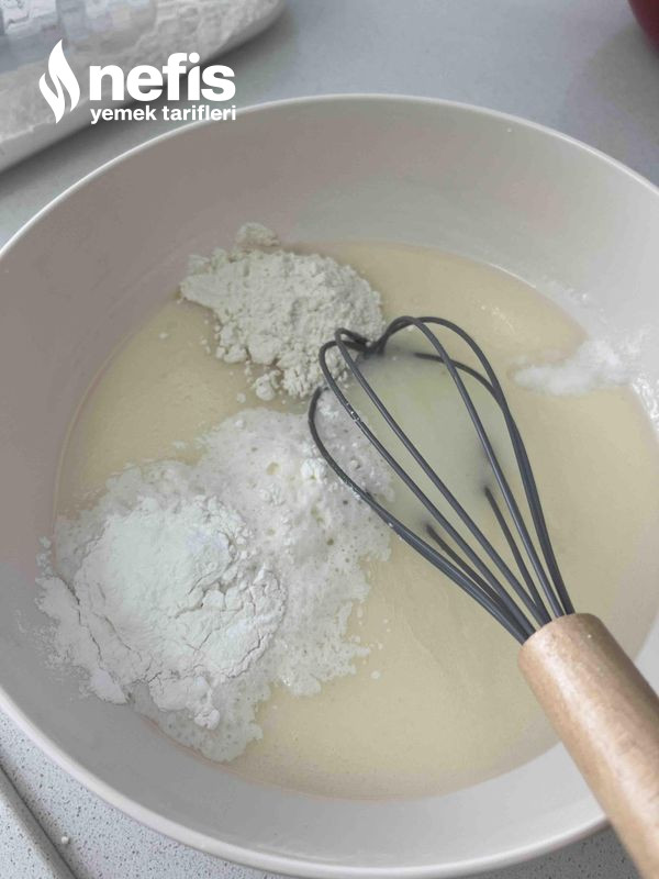 2. Daha sonra biraz un ,kabartma tozu, tuz ve şekeri koyup karıştırıyoruz.