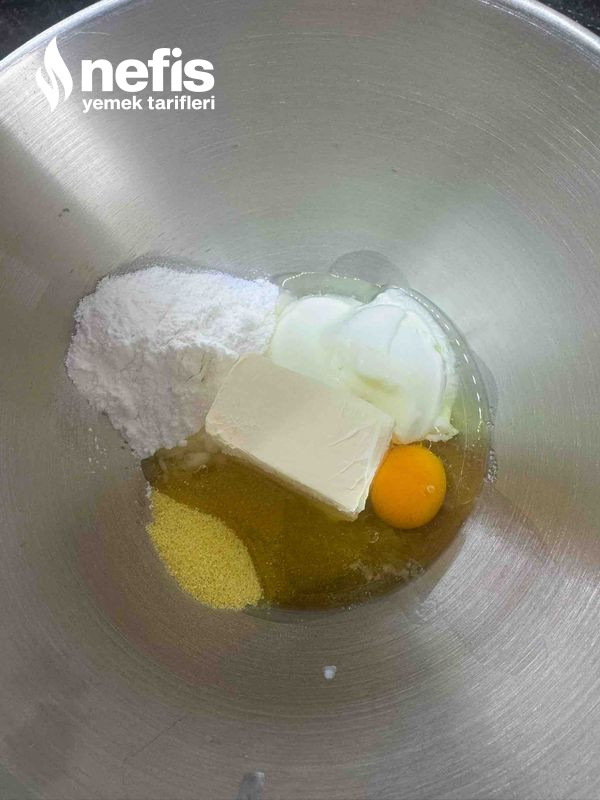 - Hamuru için; Tereyağ, sıvı yağ,irmik,yoğurt,yumurta ve pudra şekerini spatula ile karıştırıyoruz.