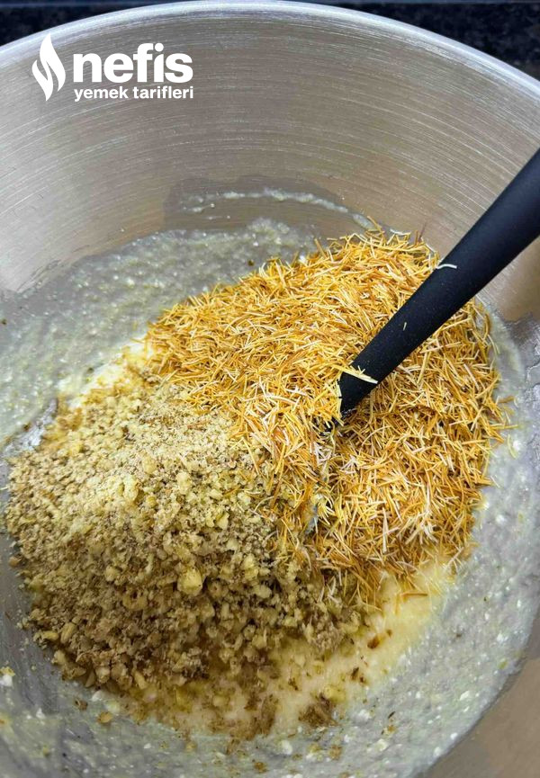 - Daha sonra kavrulmuş kadayıf ve cevizi ekleyip bir çeşit daha karıştırıyoruz.