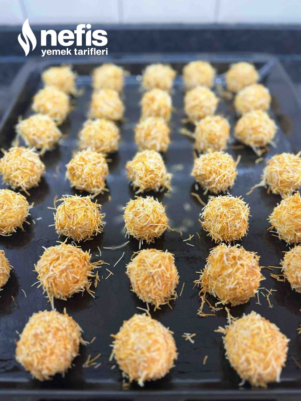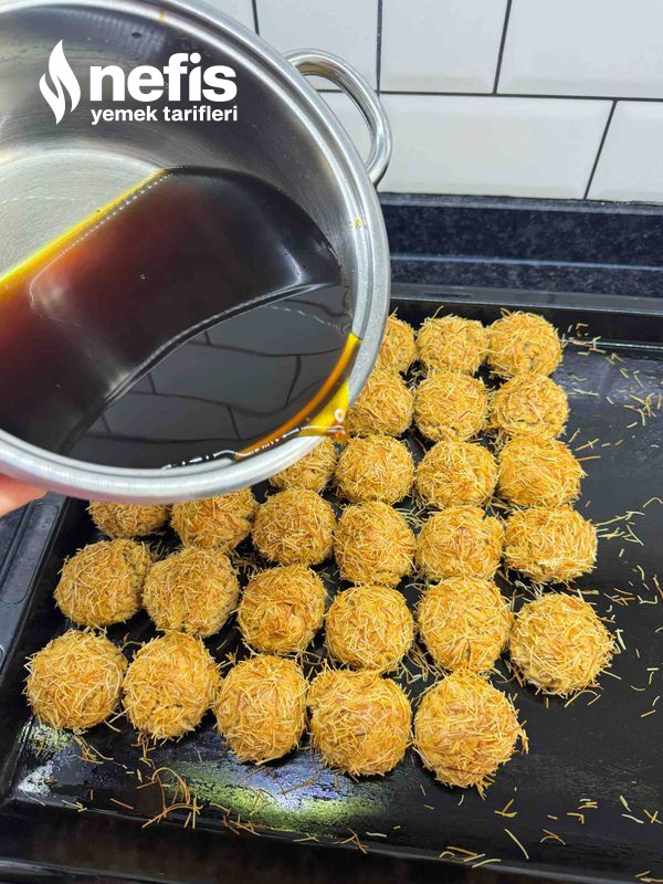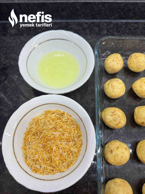- Ceviz büyüklüğünde kesimler koparıp evvel yumurta akına daha sonra kadayıfa bulayıp hafif yağlanmış fırın tepsisine diziyoruz.
