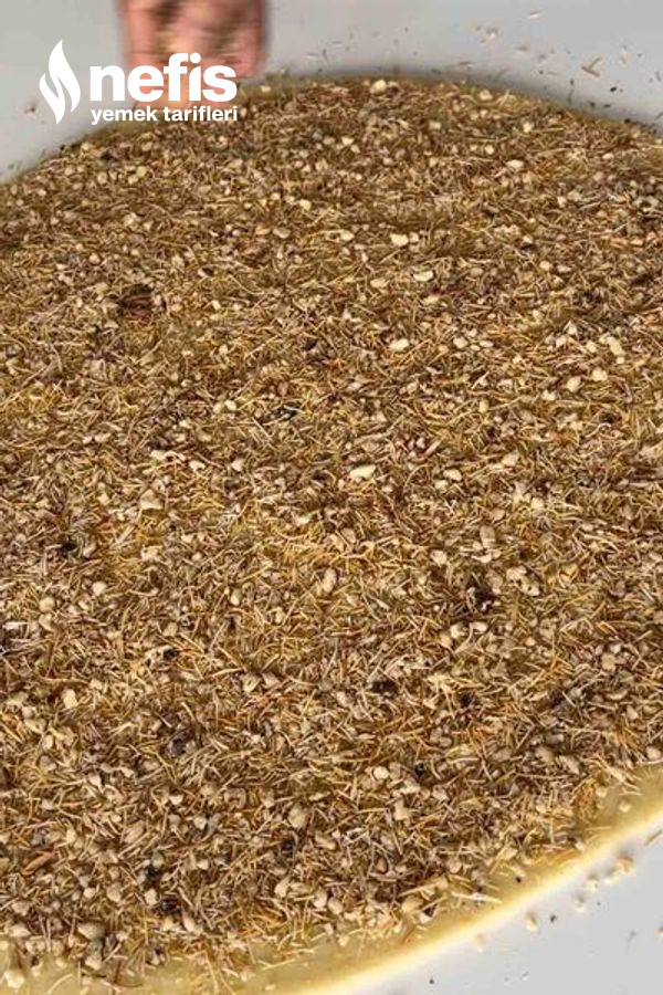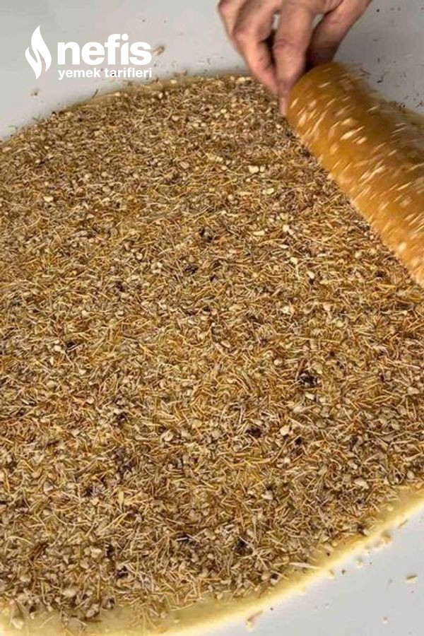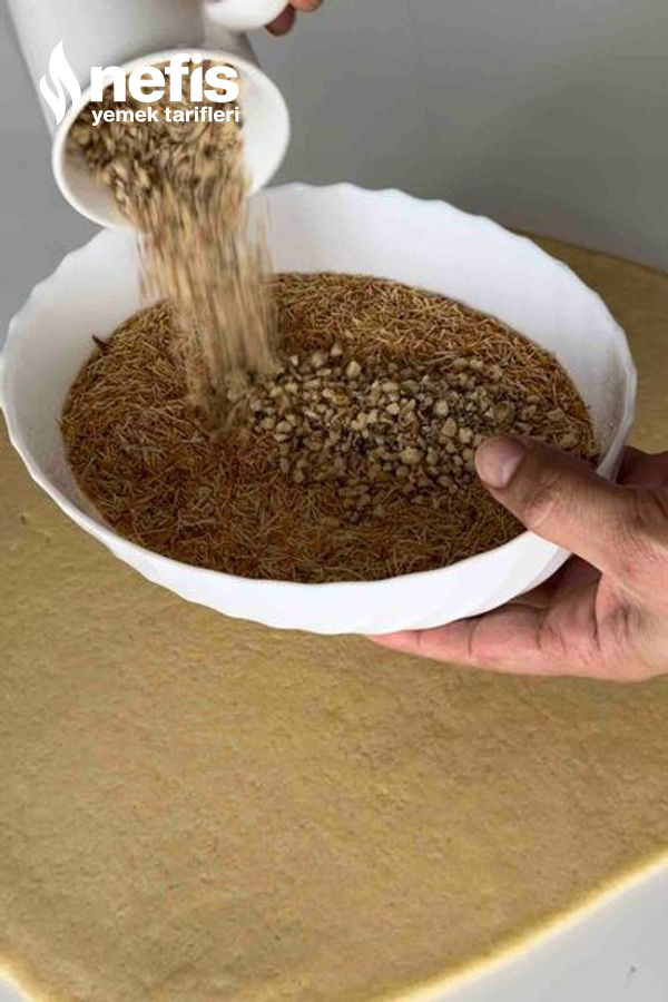 5. Şekil verin: hamuru geniş bir alanda merdane yardımıyla çok ince olmayacak biçimde açın üzerine kadayıf ve ceviz karışımı serpiştirin merdaneyle hafif bastırın.