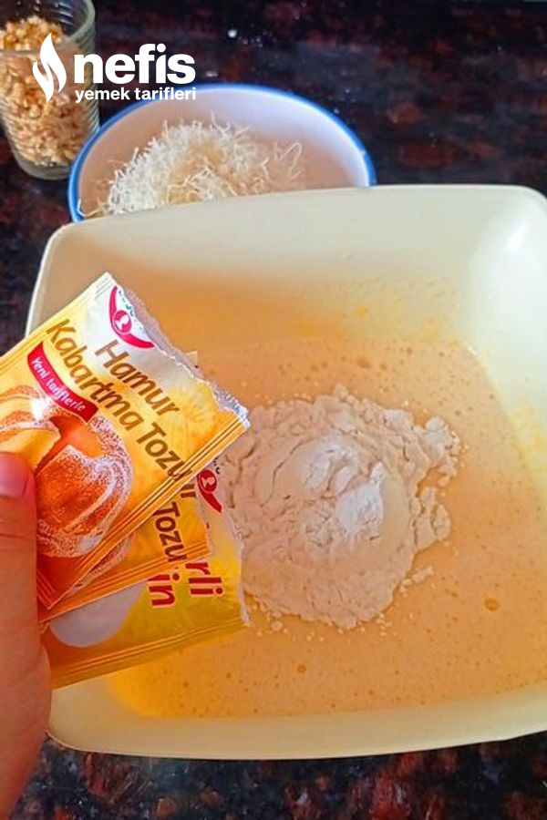 3. Ardından sıvı yağ da ekleyip tekrar çırpalım ve un, kabartma tozu ve vanilya ekleyip tekrar çırpalım.