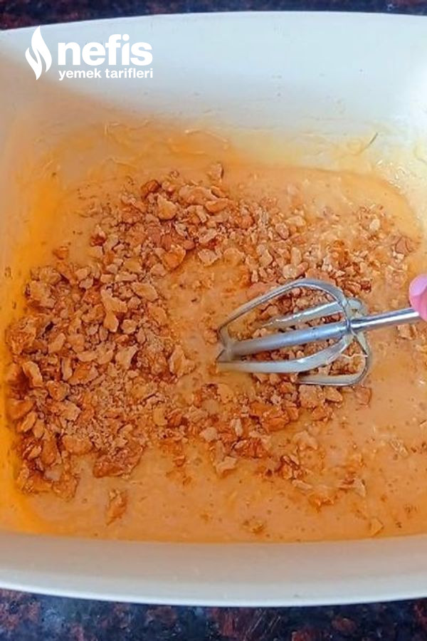 5. Son olarak da ceviz de ekleyip karıştıralım ve kullanacağınız borcam yahut fırın tepsisini güzelce her yerini yağ sürerek harcımızı boşaltalım ve üzerini kaşık yardımıyla düzeltelim .