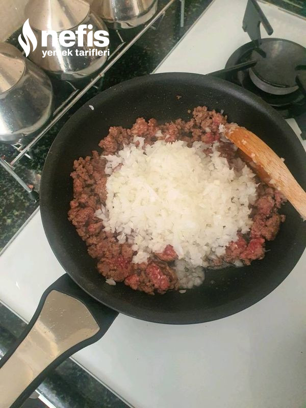 - Tavaya çok az sıvı yağ koyup, kıymayı kavuruyoruz pişmeye yakın ince doğranan soğanı üzerine ek edip, soğanla biraz daha kavurup ılıması için kenara alıyoruz.