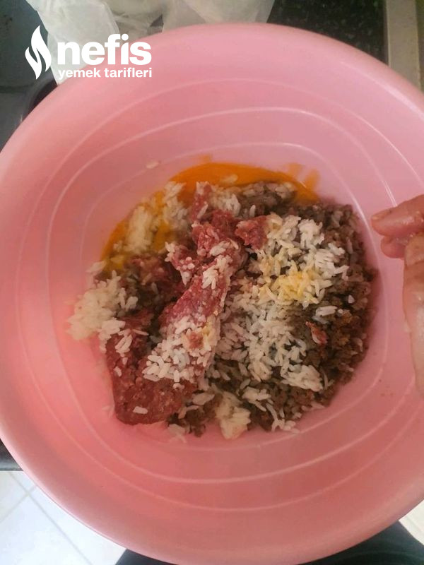 - Ayırdığımız öteki kıymayı yoğurma kabına alıyoruz içine kavurduğumuz kıyma harcı, pilav ya da haşlanmış pirinç, yumurta, baharatları da koyup, özleşene kadar yoğurup dolapta yarım saat bekletiyoruz (zamanı olan 2 saatte bekletebilir)