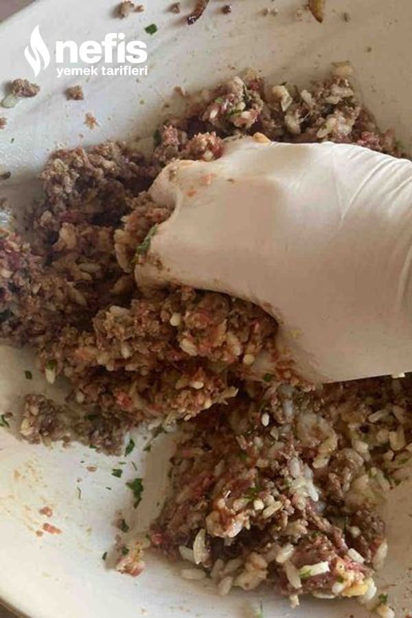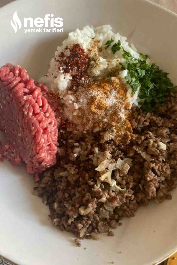 - Geniş bir kaba kalan 200 gram çiğ kıymayı, 300 gram pişmiş kıymayı ve haşlanmış pirinçi alalım.