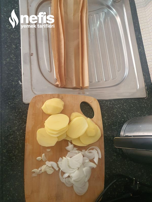 - Patates büyükse ortadan ikiye kesip yarım ay biçiminde, ufak sa patatesiniz 2 adet yanlamasına ince şeritlerde kesin başka malzemeleride birebir formda kesin. Arzı ederseniz kereviz havuç mantar da koyabilirsiniz.