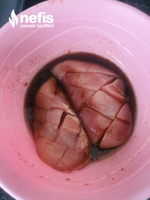 - Tavuk göğüslerinin her iki tarafına da tam olarak kesmeyecek formda dikine ve yatay olacak biçimde derin çizikler atalım.