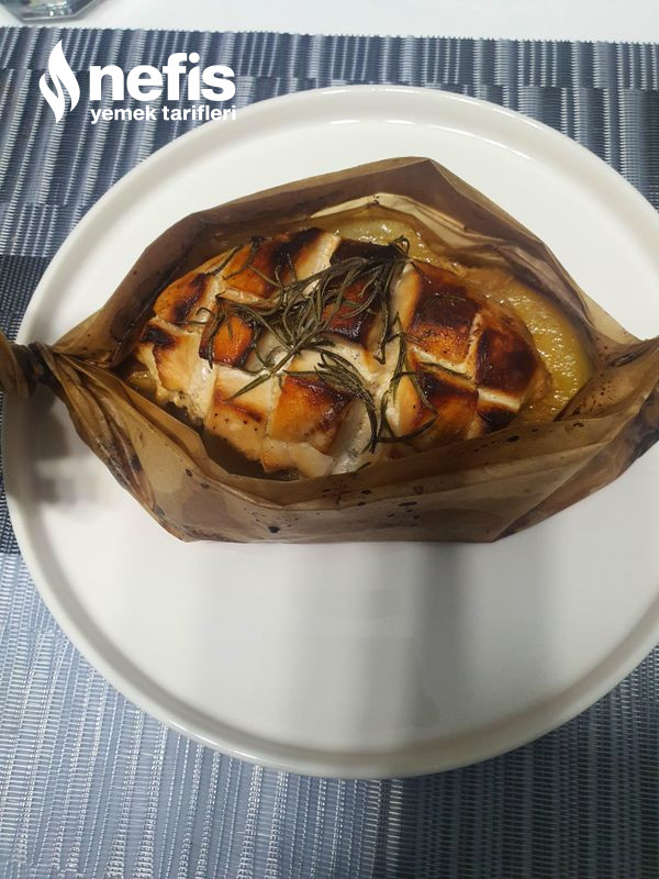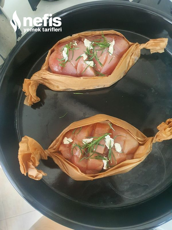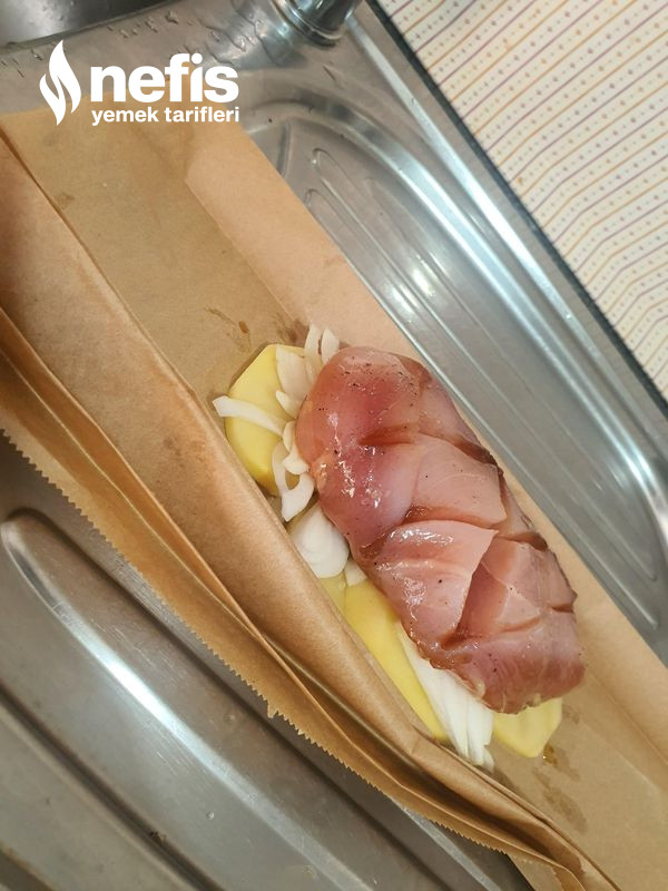 - Sırayla patates ,soğan ,sarımsak en üste soslu tavuk ekleyip kayık biçimine getirin ve her iki taraftanda kağıdı çevirerek kapatın.