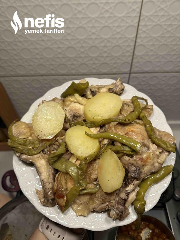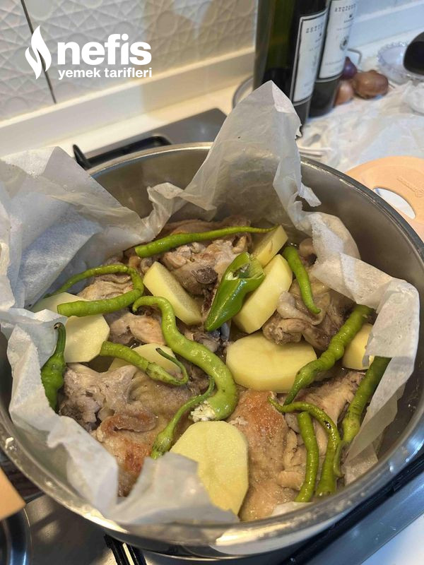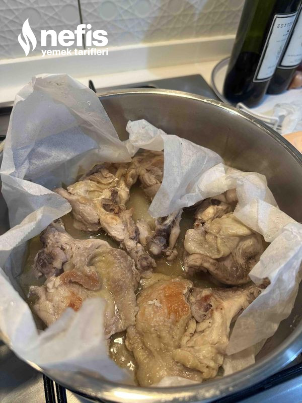 - Bir tencereye yağlı kağıt serilir üzerine tavuklar dizilir.