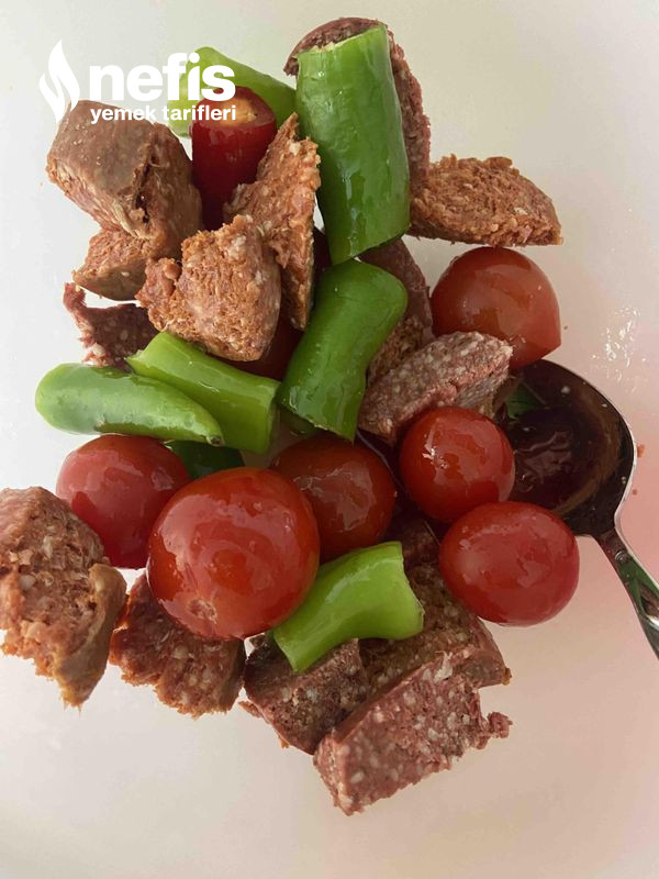 1. Sebzelerimizi yıkıyoruz ve bir kaba doğruyoruz, üzerine sucuklarımızı doğruyoruz.