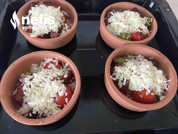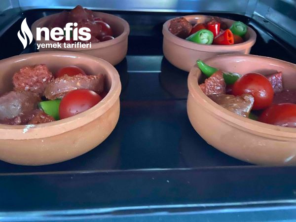 3. Kase güveçlerimizi bir tepsiye yerleştiriyoruz ve sucuklardan,sebzelerimizden ekliyoruz 4 kase çıkıyor.
