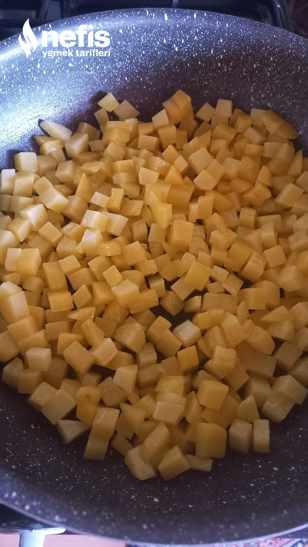 1. Tavamıza sıvı yağını alıyoruz. Üzerine minik minik küp halinde doğradığımız patatesleri ekliyoruz ve bu formda bir ölçü pişiriyoruz.