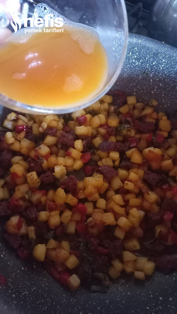 4. Sucuklarımız da pişince üzerine çırpılmış yumurtayı ekliyoruz ve tuzunu ek ediyoruz.