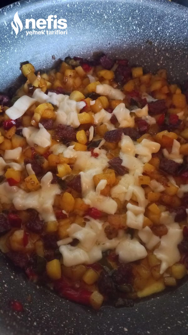 3. Biberler ve patates pişince sucukları ekliyoruz.