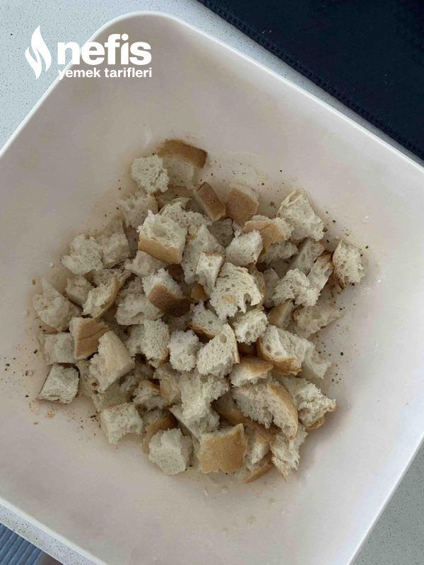 - Ekmekleri küçük kesimlere ayıralım. Karışıma ek edip karıştıralım.