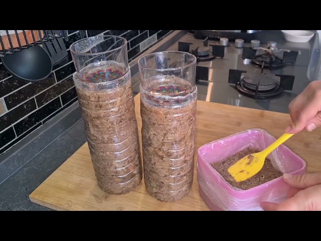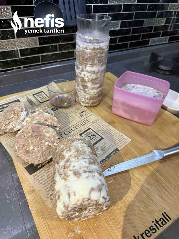 - Aralarında boşluk kalmasın üzerine kaşıkla hafif bastırın. Üzerinin düz olması için de yük yapsın diye bir kase koyup dolaba kaldırın 4-5saat büsbütün soğuyup donmasını bekleyin.