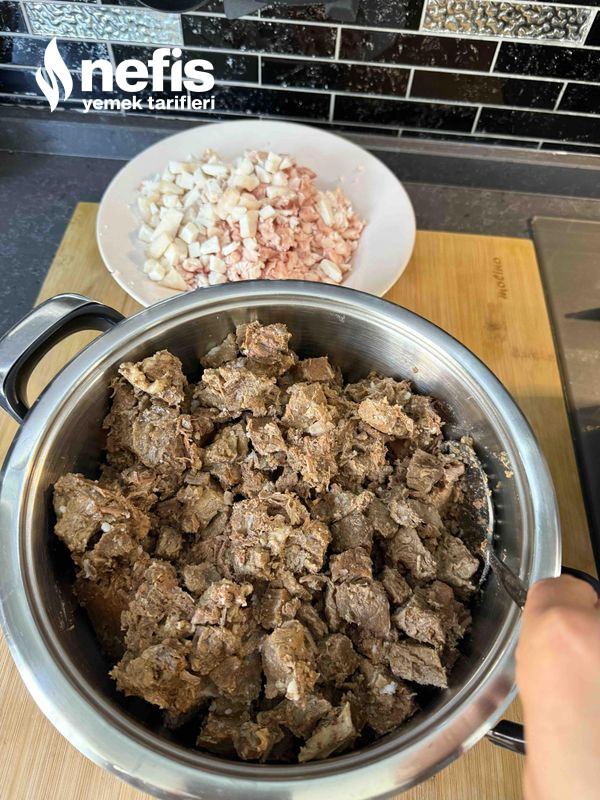 - Etleri yumuşayıp tel tel ayrılana kadar istet düdüklü tencerede isterseniz olağan tencerede biraz tuz ek ederek pişirin. Farklı bir tencerede iç yağları eritin pişmiş etleri de üzerine ek edin.