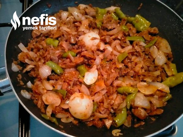 - İnce uzunlukta doğranmış mantarlar tavaya alınır tavanın kapağı kapatılıp, evvel sulanması sonra suyunu çekmesi sağlanır. İri doğranmış biberler ve jülyen doğranmış soğan eklenir zeytinyağı ile 10 dk kavrulur.