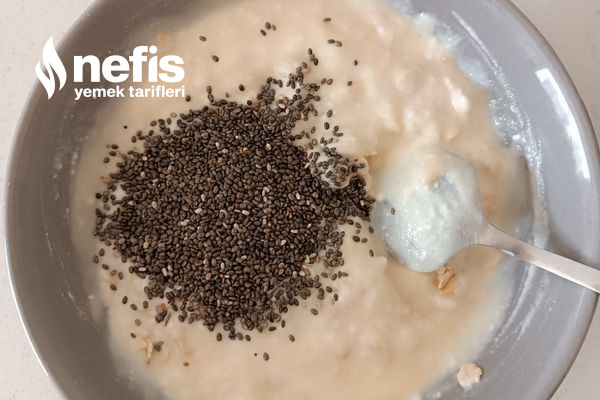 - İlk olarak bir kaseye yoğurt, keçiboynuzu özü, yulaf ve isteğe bağlı chia tohumunu alıp düzgünce karıştırın.