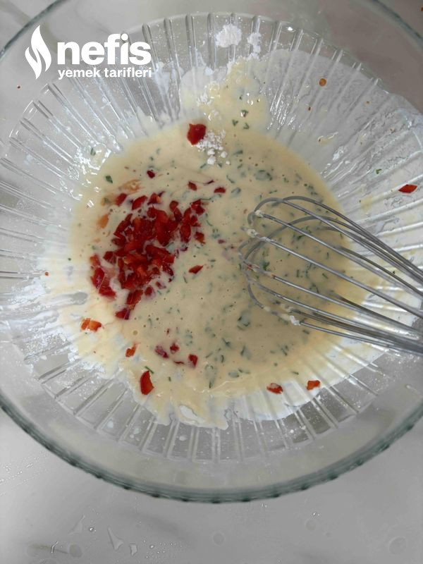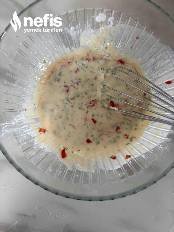 3. Kaşar peynirini ,unu, kabartma tozunu koyup karıştırınız ,kapya biberini ,maydanozda ek ediniz.