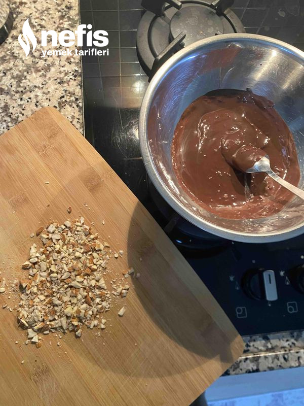 - Erimiş çikolatanın altını kapat adan bademleri kıyıp, içine atın.