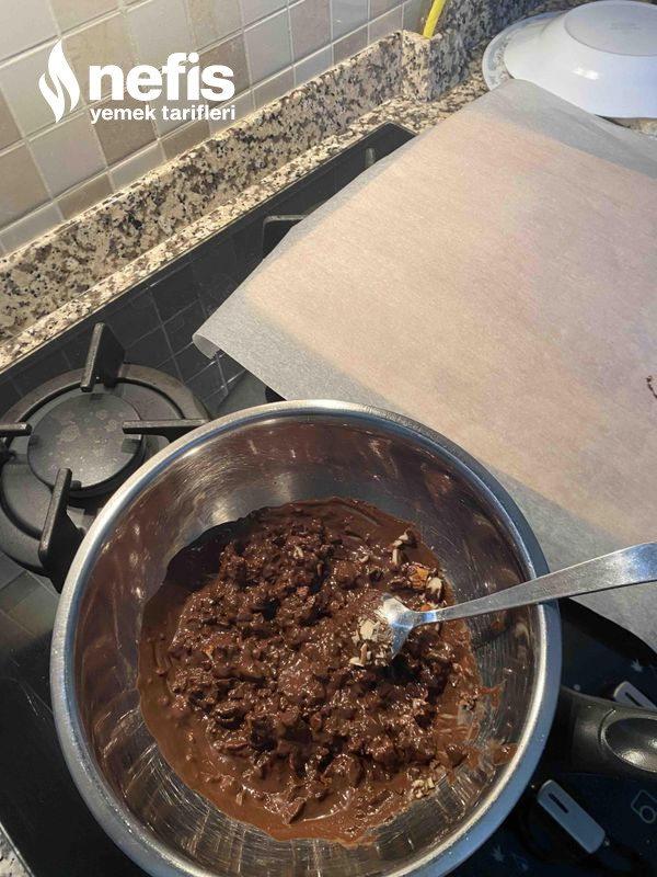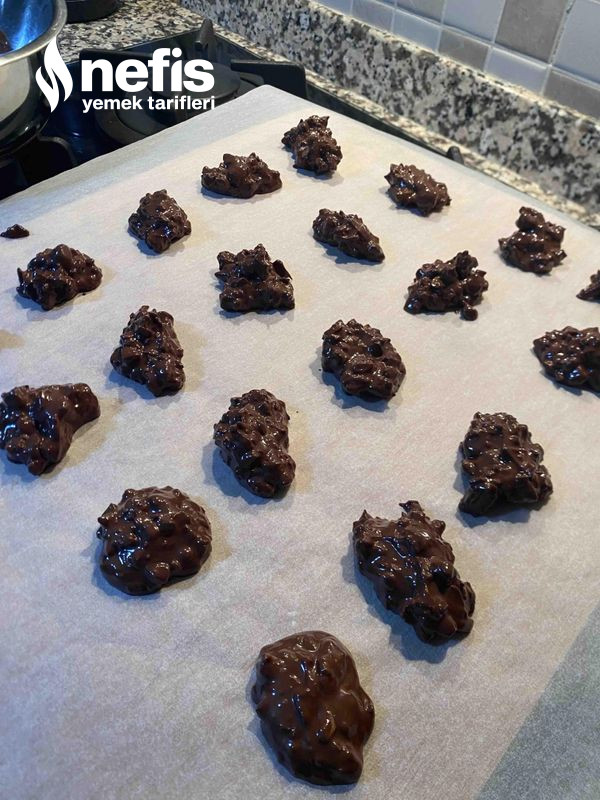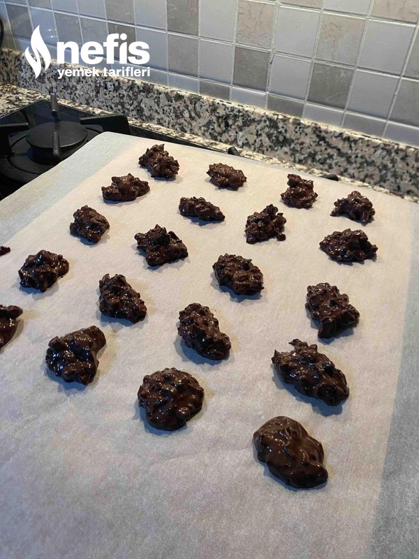 - Yağlı kağıdın üzerine kaşıkla çikolatayı döküp, dolapta soğutunuz. Afiyet olsun.
