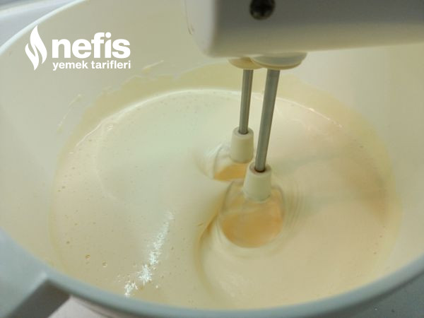 - Oda sıcaklığındaki yumurtaları kırıp şekeri ekleyerek bir fiske tuzu da koyarak mikserle 10 dakika kadar beyazlaşıp yoğunlaşıncaya kadar çırpalım, çırpmaya devam ederek, yarım bardak ılık suyu tam mikserin çırpan yerine yavaş yavaş ekleyelim, birkaç saniye daha çırpıp bırakalım.